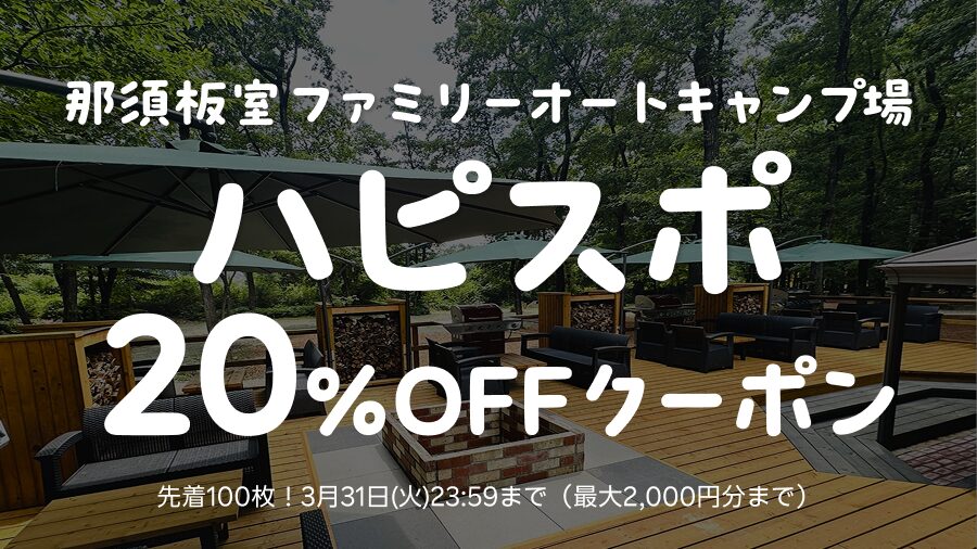 楽天トラベルキャンプからのご予約で20%OFF 2026年02月20日 - お知らせ ↑ ↑ ↑ 画像をクリックして楽天トラベルキャンプへ ↑ ↑ ↑ 楽天トラベルキャンプで「ハピスポ」の特集を組んでおります。 クーポンをGETして対象期間内でご予約いただくと20%OFF(最大2,000円分まで)でご宿泊いただけます! 是非クーポンをご活用いただきましてお得な価格でハピスポをご利用ください。 Twitter Facebook Pocket B!はてブ LINE